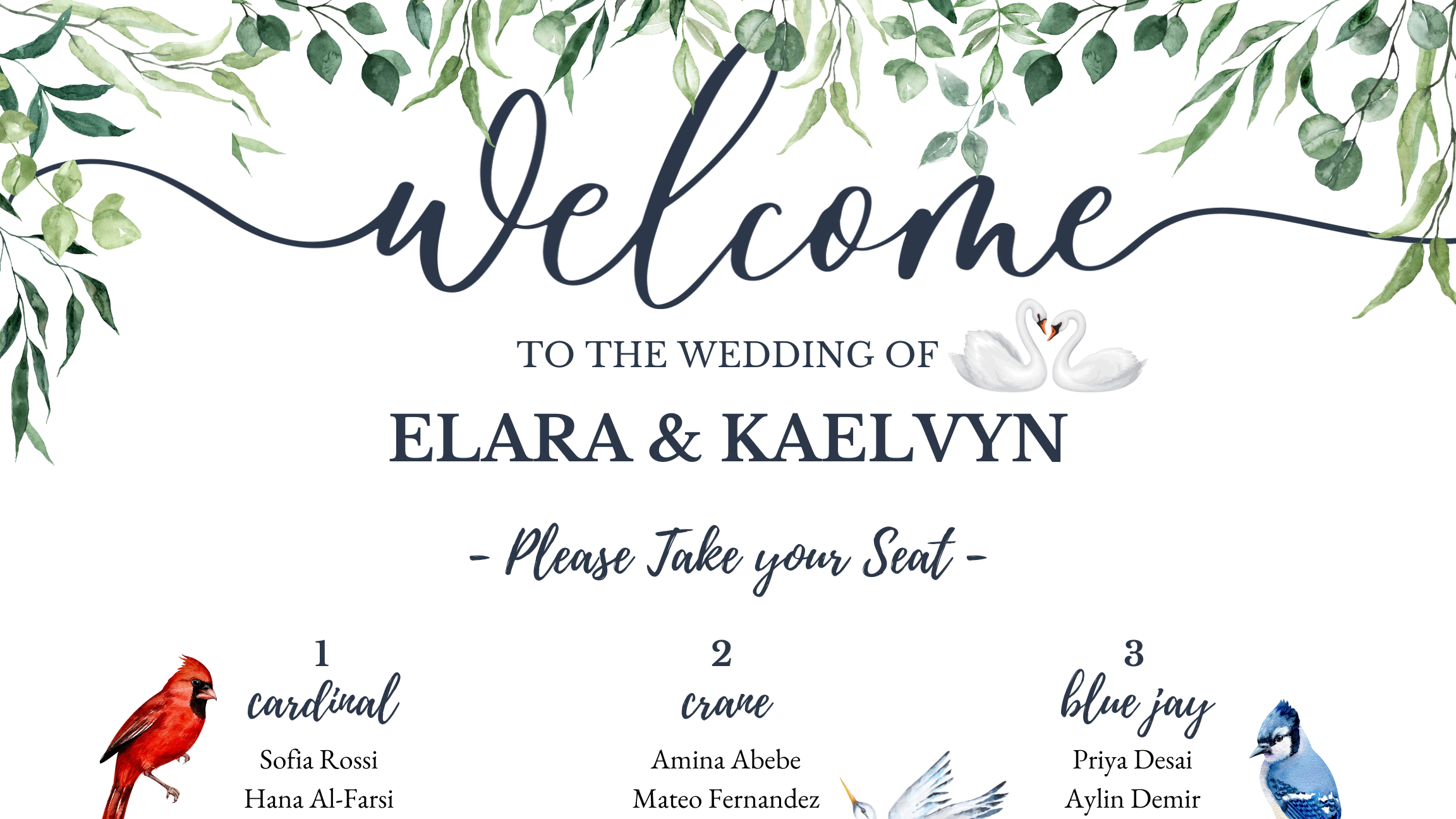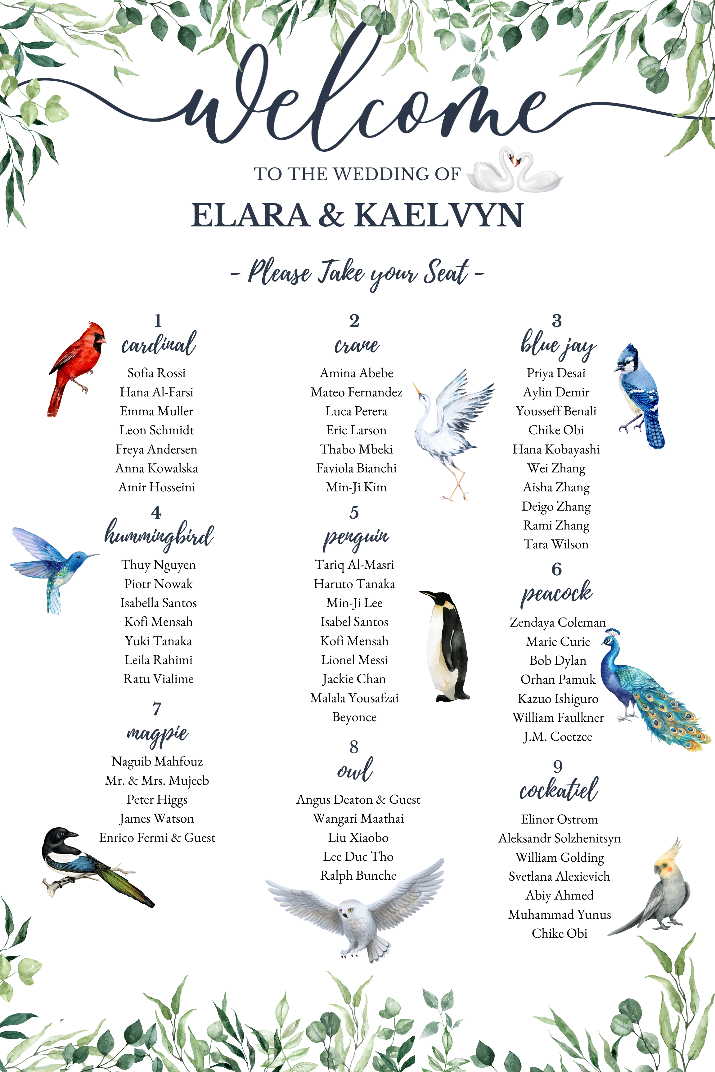 Wedding Seating Chart with Bird Theme.